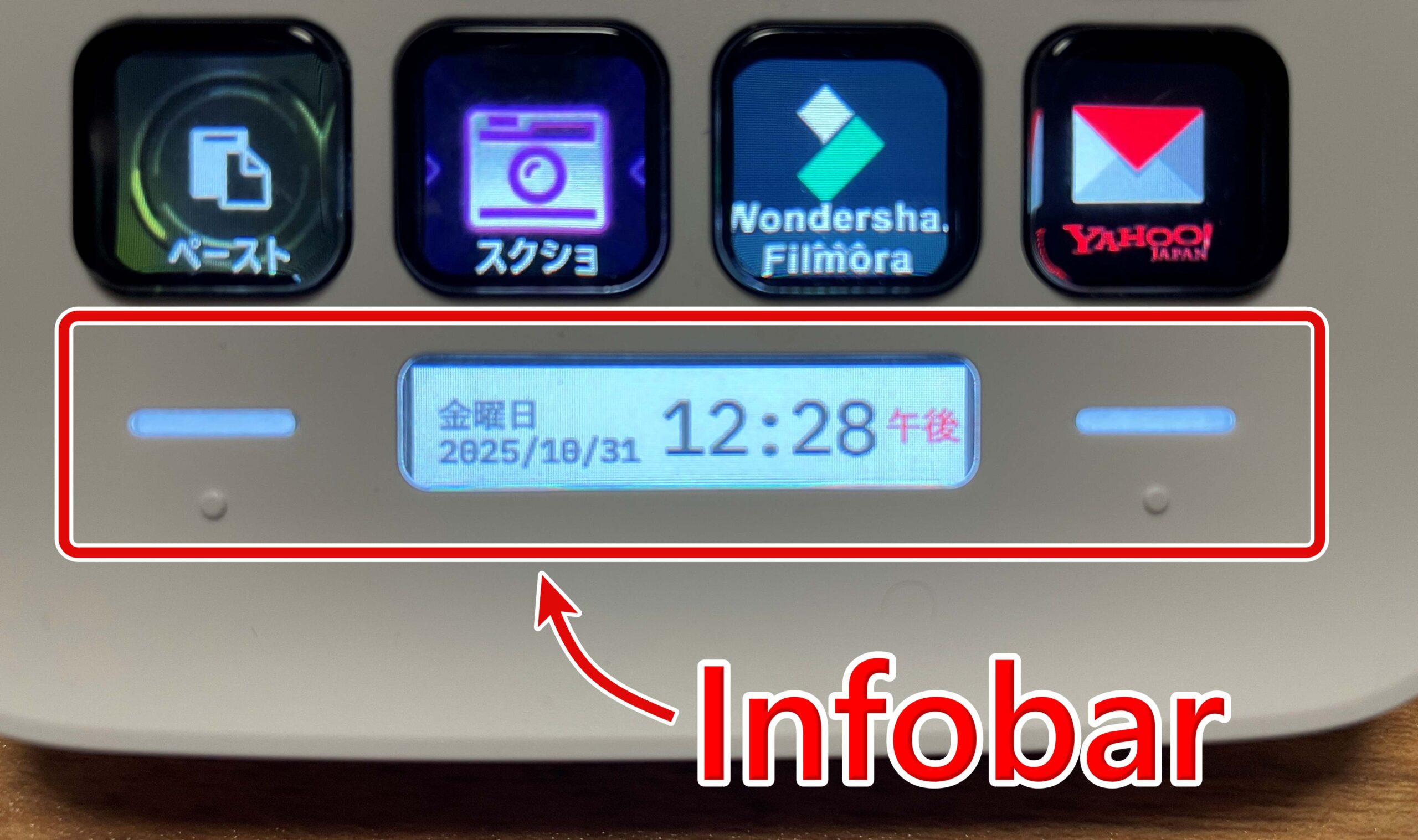 - 対策:ここで活躍するのが「ページ切り替え」機能です。Infobar両脇のタッチポイントを使えば、ページをめくるようにして多くのボタンを使えます。「Web会議用ページ」「執筆作業用ページ」のように、作業内容ごとにページを分けることで、実質的に無限のボタンを活用できます。この使い方に慣れると、8つのボタンという物理的な制約はそこまで気にならなくなりました。