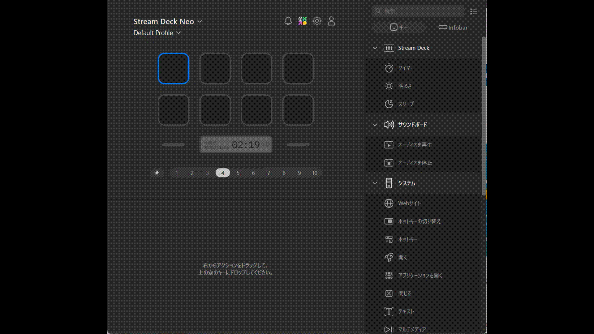 - ページ切り替え:作業内容ごとにページを分ければ、最大で10ページ、合計80個ものアクションを登録可能。