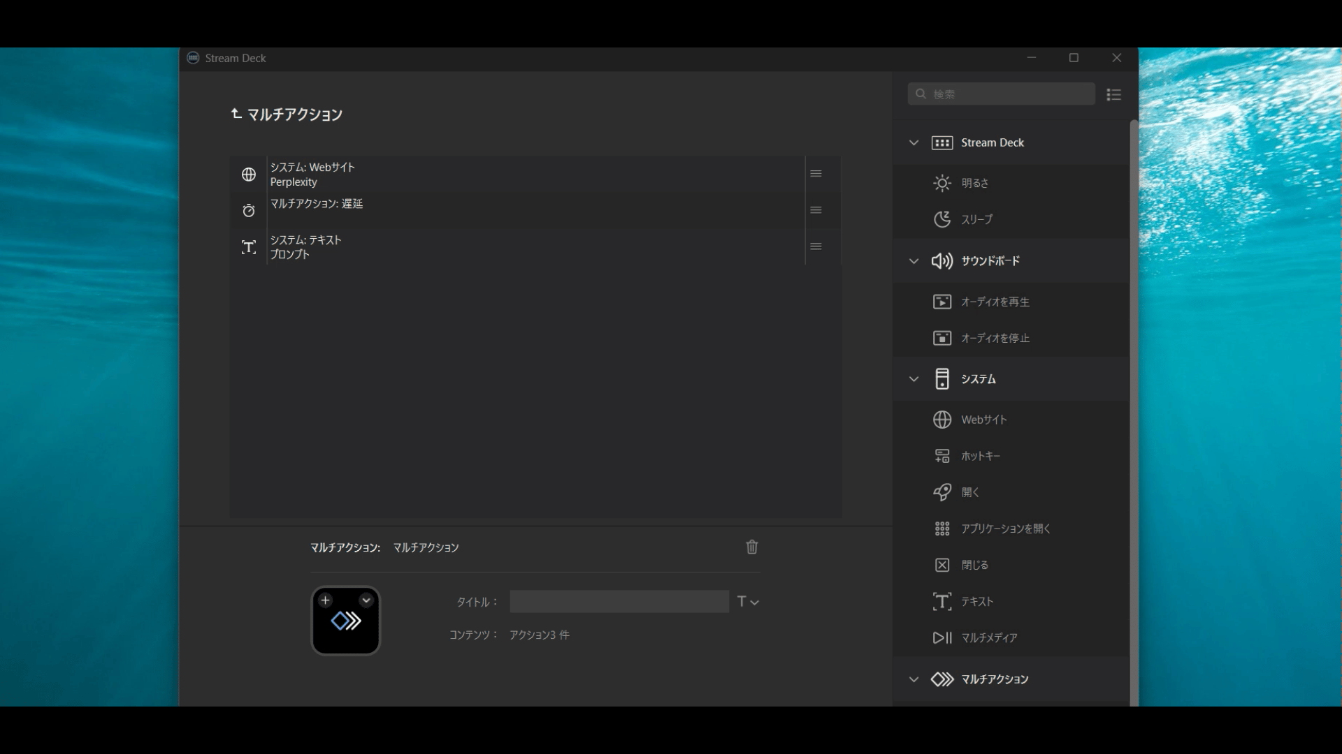 Stream Deck Neoの真骨頂ともいえるのが、この「マルチアクション」機能です。これは、一連の操作を一つのボタンにまとめて登録し、ワンタッチで実行できるというもの。
